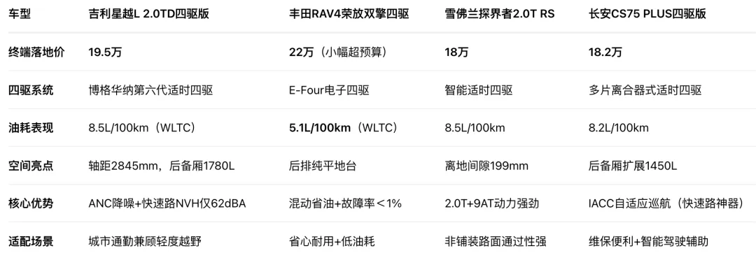 全能性价比王 → 星越L(19.5万级空间+四驱+静谧性,通勤露营全能);