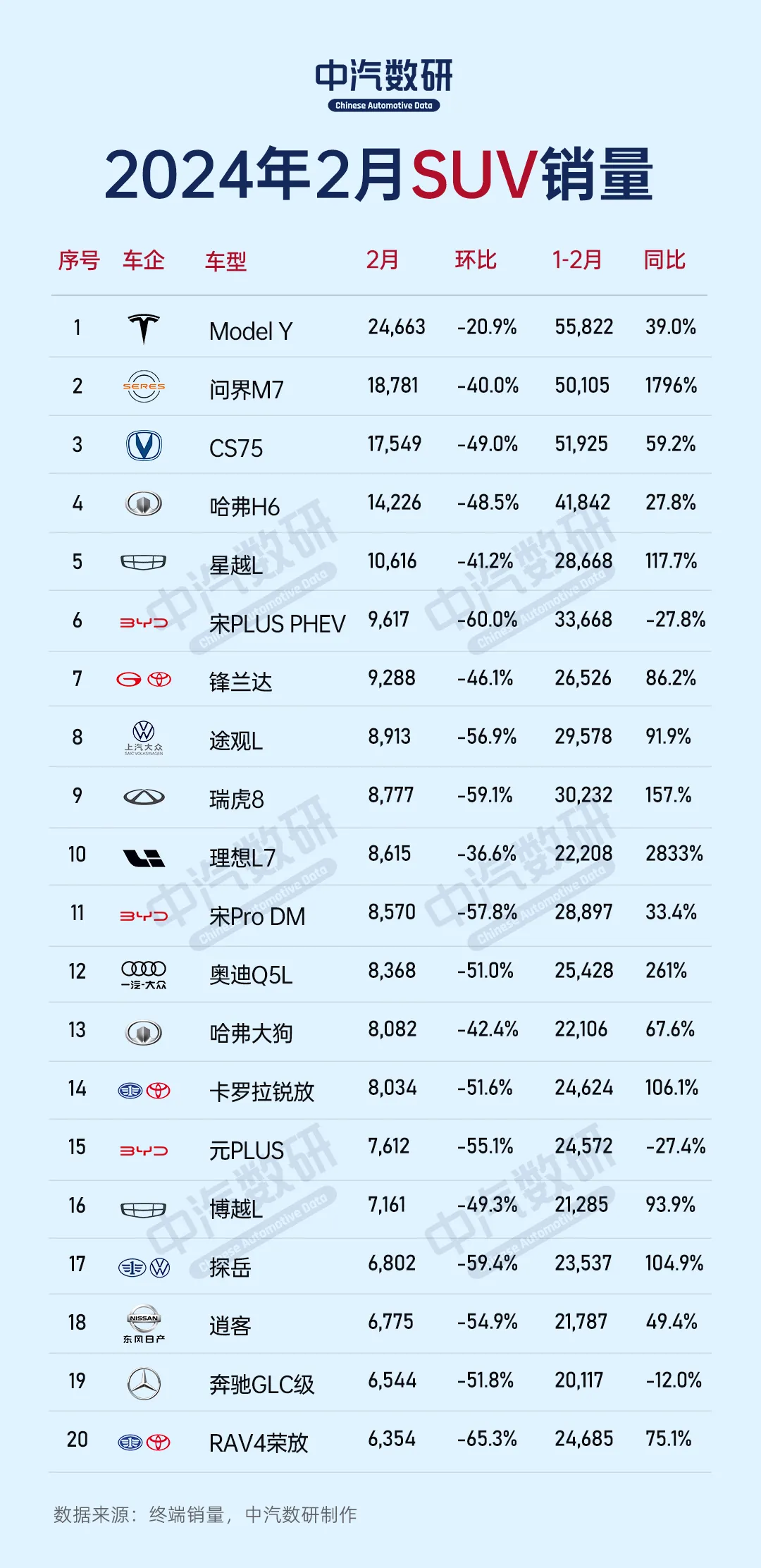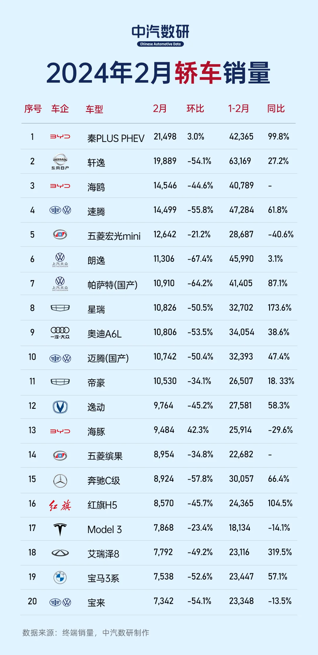 SUV:Model Y重回榜首,问界屈居亚军,哈弗挤进前四SUV销售54.5万辆,占比为48.8%,特斯拉Model Y以其亮眼的表现高居榜首,成为了行业瞩目的焦点;而哈弗H6则现在第四名的位置上,保持了自己在市场上的强势地位。特斯拉Model Y这次真是大放异彩,销售量达到了2.47万辆,远远甩开对手。可见,在电动汽车市场上,特斯拉依旧是那个无人能敌的王者。问界M7紧随其后,1.88万辆的销量也是相当可观,证明了新势力在汽车领域中越来越得到消费者的青睐。哈弗H6、长安CS75 PLUS等国产车型同样表现出色,销量都在1.4万辆以上。星越L、宋PLUS DM-i、宋Pro DM-i等车型更是超过了8000辆大关,在竞争如此激烈的市场环境下能够取得这样的成绩实属不易。本田CR-V以5961辆位列前30名之内,并且其他几款车型如途岳、捷途旅行者、红旗HS5和理想L9都保持着五六千辆的销售成绩。轿车:同比下滑23.9%,秦PLUS DM-i蝉联销冠在2月份的轿车销量榜上,我们见证了一场精彩纷呈的市场竞赛。2月轿车市场累计销量49.8万辆(占比为46.4%),同比去年同期降低23.9%。日产轩逸,这位曾经的销量冠军,以19,889辆的销量屈居第二,它的失位不仅标志着数字上的变化,更显露出消费者偏好的转移。这一转变可能源于市场对新能源和智能化车型的日益青睐,或是对日产轩逸本身的期待有所变化。