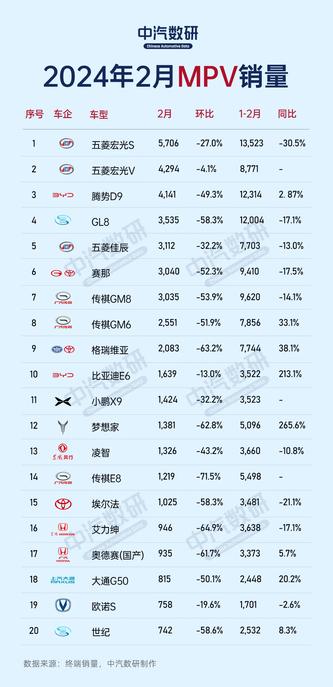 2月MPV销售5.3万辆,占比约4.8%,根据公布的数据来看,国内MPV市场遭遇了一场寒流,整体销量跌幅超过了50%,仅一款车型销量超5000辆。五菱宏光S、五菱宏光V、腾势D9分别荣获冠亚季军。而本田奥德赛、本田艾力绅纷纷跌出前十,整体表现也是不容乐观。免责声明:本文来源公众号“中汽数研”,文章通过参考公众媒体内容,整理、翻译、编辑而成,仅供读者参考。文中的观点和内容不具有任何指导作用,对读者不构成任何项目建议或承诺!如果本文不慎侵犯您的权益,请与我们联系,我们将及时处理。