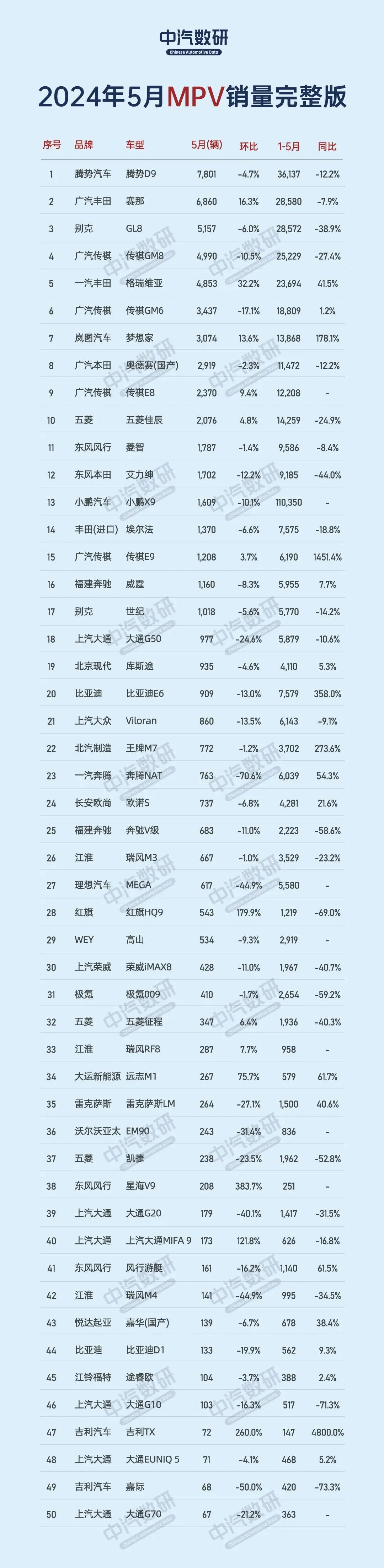 数据显示,5月份国内狭义乘用车市场零售销量同比下降1.9%,环比增长11.4%。5月份轿车同比下降7.7%,环比增长10.7%;5月份SUV销量同比增长6.3%,环比增长14.0%;5月份MPV销量同比下降18.3%,环比下降5.5%;5月份新能源狭义乘用车销量同比增长38.6%,环比增长18.8%。