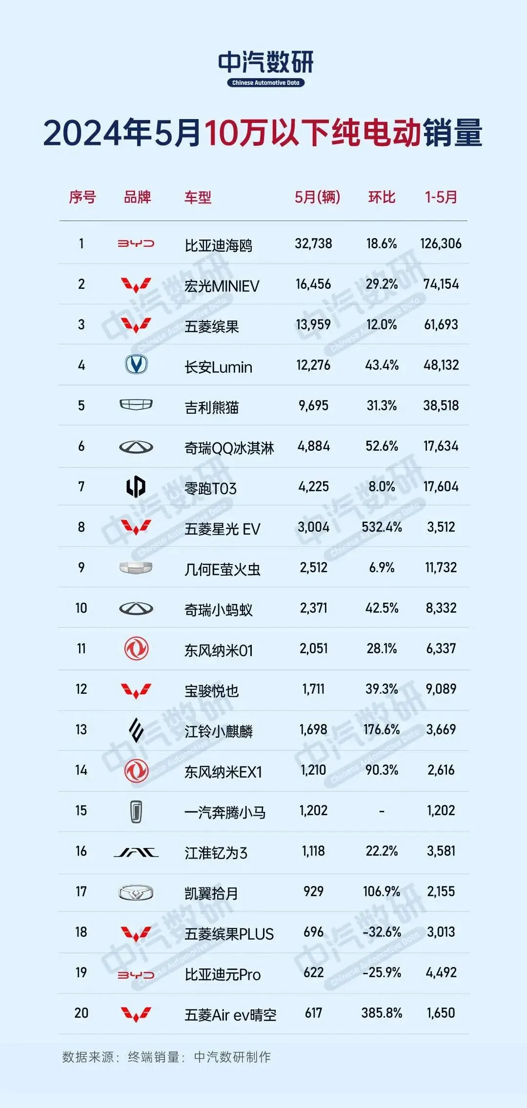 纯电动汽车TOP1:比亚迪海鸥,5月3.27万辆,1-5月12.63万辆;