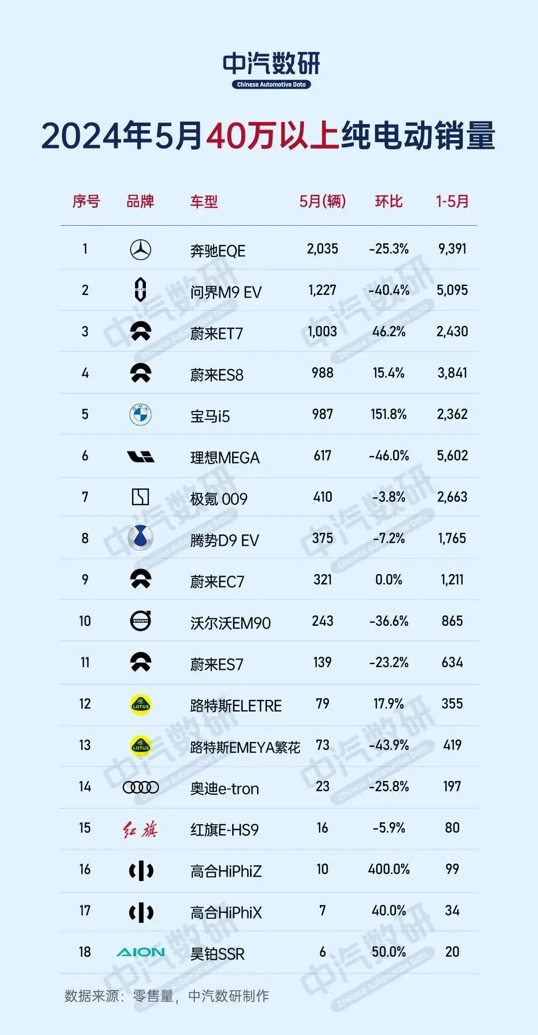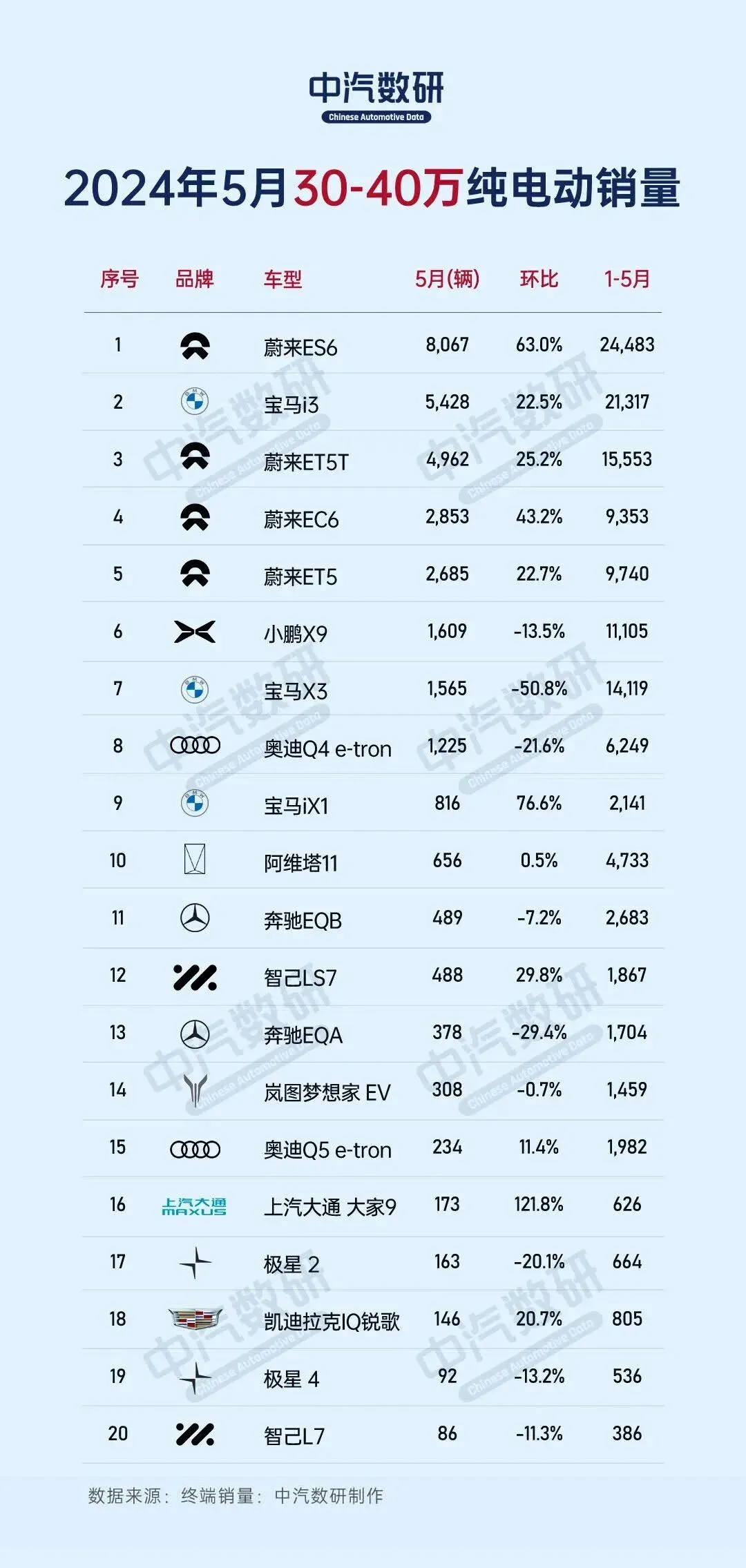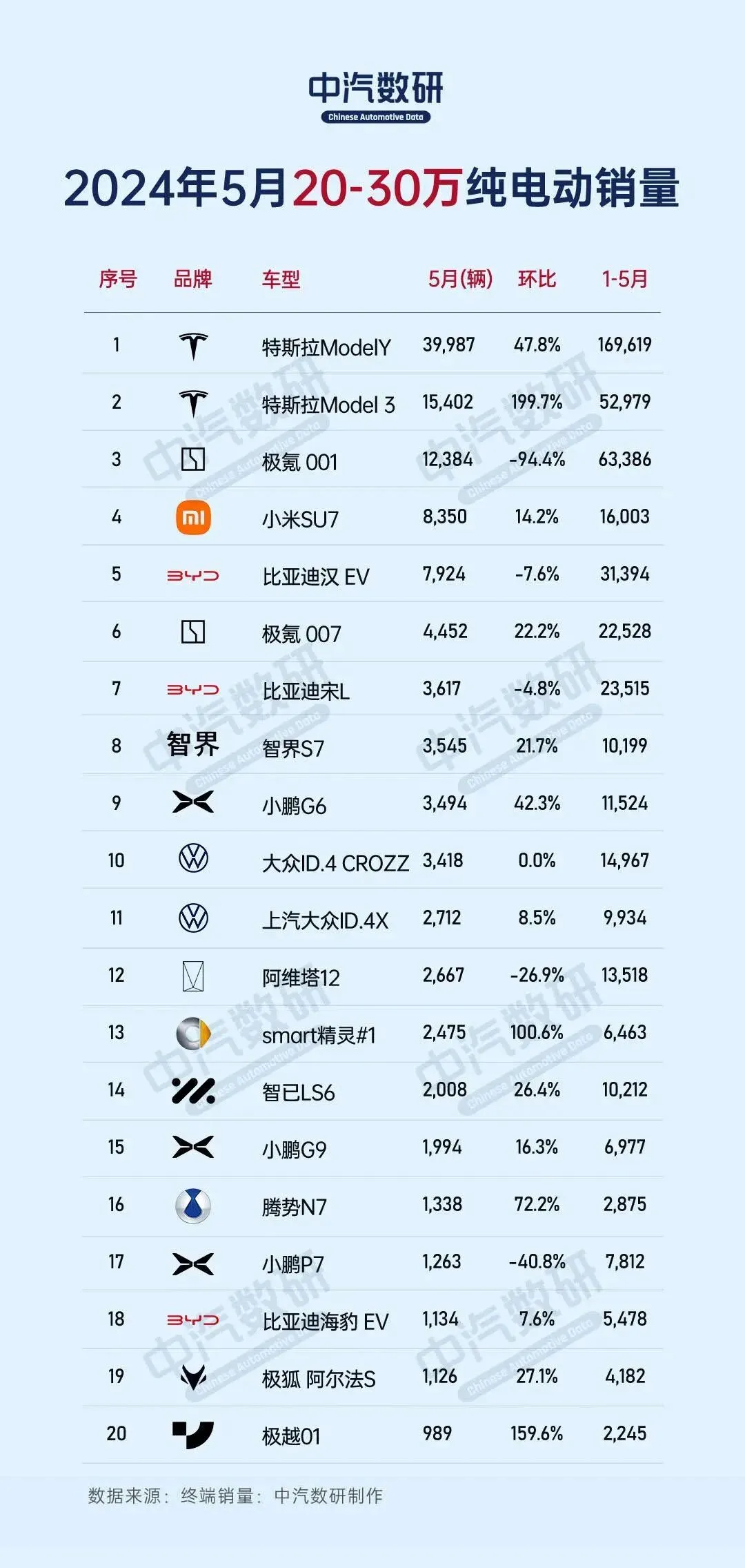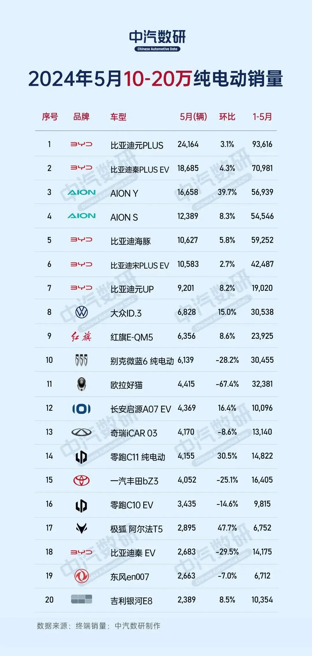 >2024年5月纯电动汽车销量排行(按价格区间)
