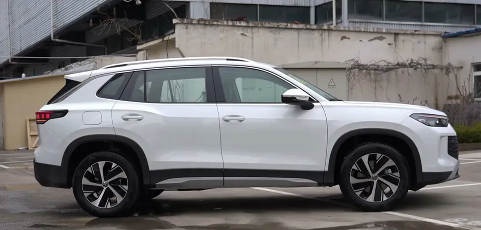 白色探岳L侧面特写,线条流畅,轮毂设计独特。