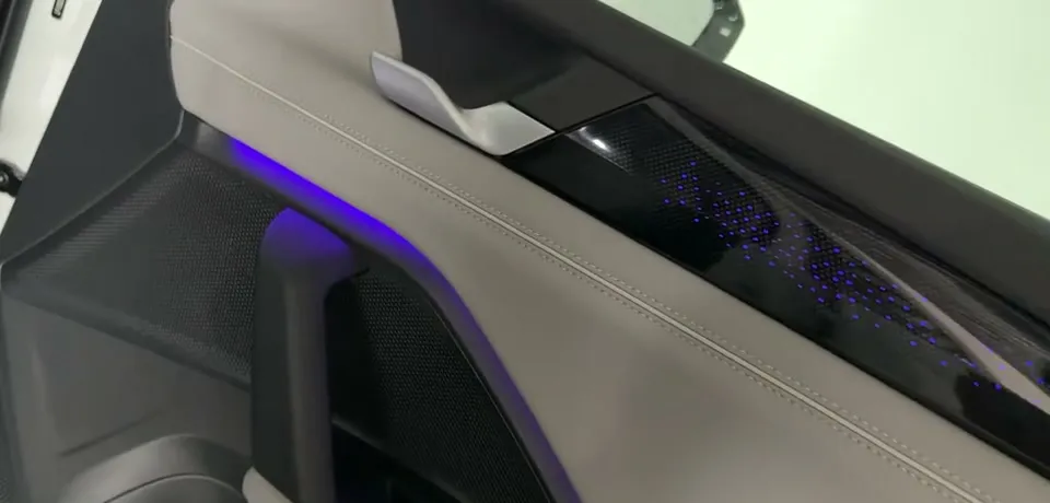 ,可以在中控和门板的饰板上显示,晚上开起来氛围确实不错。中控屏幕支持5G网联,还有Carplay、Carlife这些都有。