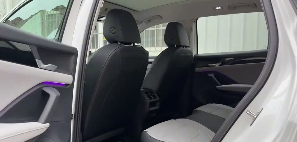 后排的话,座椅是黑白双色的,配有后排空调出风口和USB接口。我让一个身高179cm、160斤的朋友坐进去体验了一下,