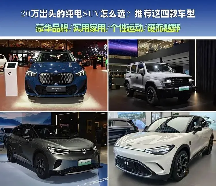 在20万出头的购车预算下,新能源SUV应该怎么选?今天为大家推荐四款车型,分别是宝马iX1、ID.4 CROZZ、smart精灵#3以及坦克300新能源。