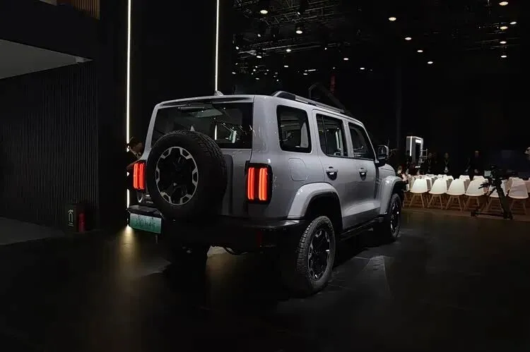 车身侧面线条平直,配备黑色轮眉、车顶行李架及侧开式尾门。车尾标配外挂式全尺寸备胎,尾灯为竖向布局。其接近角为32度,离去角为33度,具备较好的通过性基础。