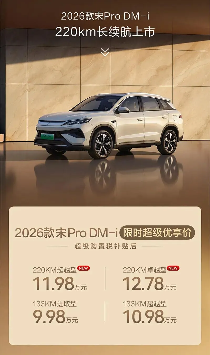 价格:官方指导价9.08-13.08万元,2025款75km超越型裸车价9.4万元,落地约9.9万元;2026款DM-i 133KM卓越型裸车价12.58万元,落地不超14万元。