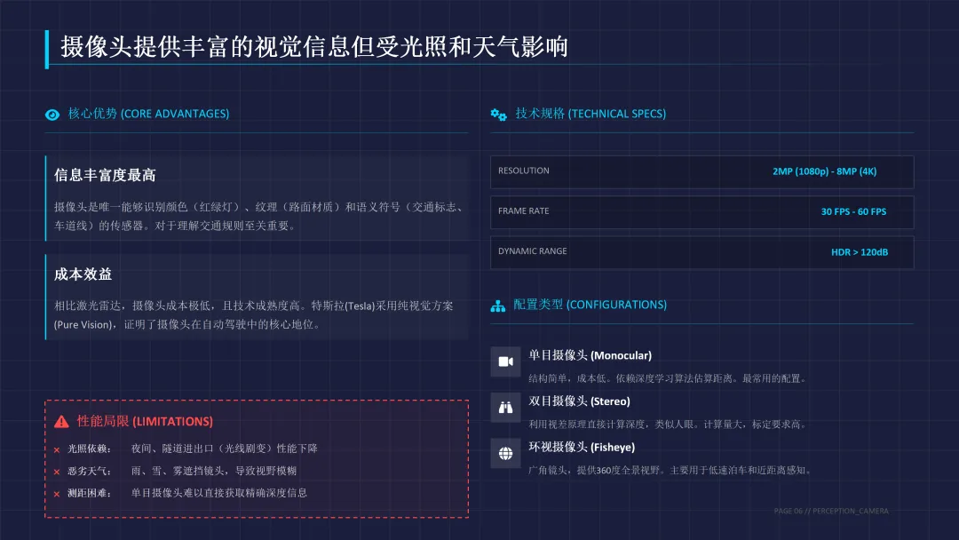 •摄像头(Camera): 提供丰富的颜色和纹理信息,成本低,但受光照和天气影响大。