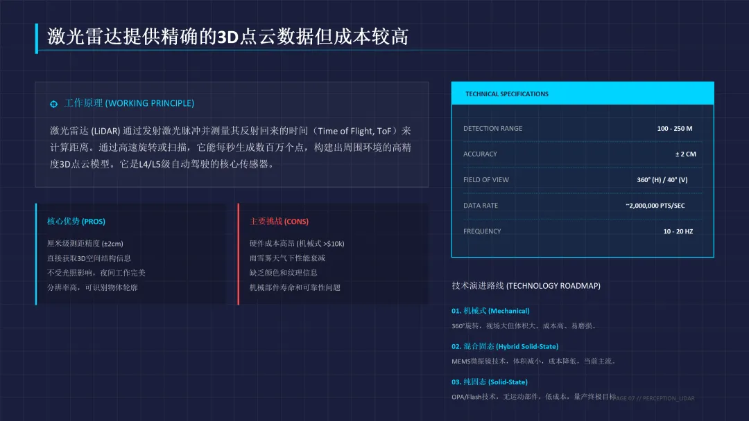 •激光雷达(LiDAR): 直接获取精确的三维点云数据,测距精度高,但成本昂贵且在恶劣天气下性能下降。