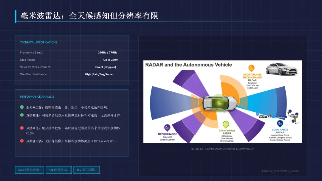 •毫米波雷达(Radar): 对速度敏感,穿透性好(不受雨雾影响),但分辨率较低。