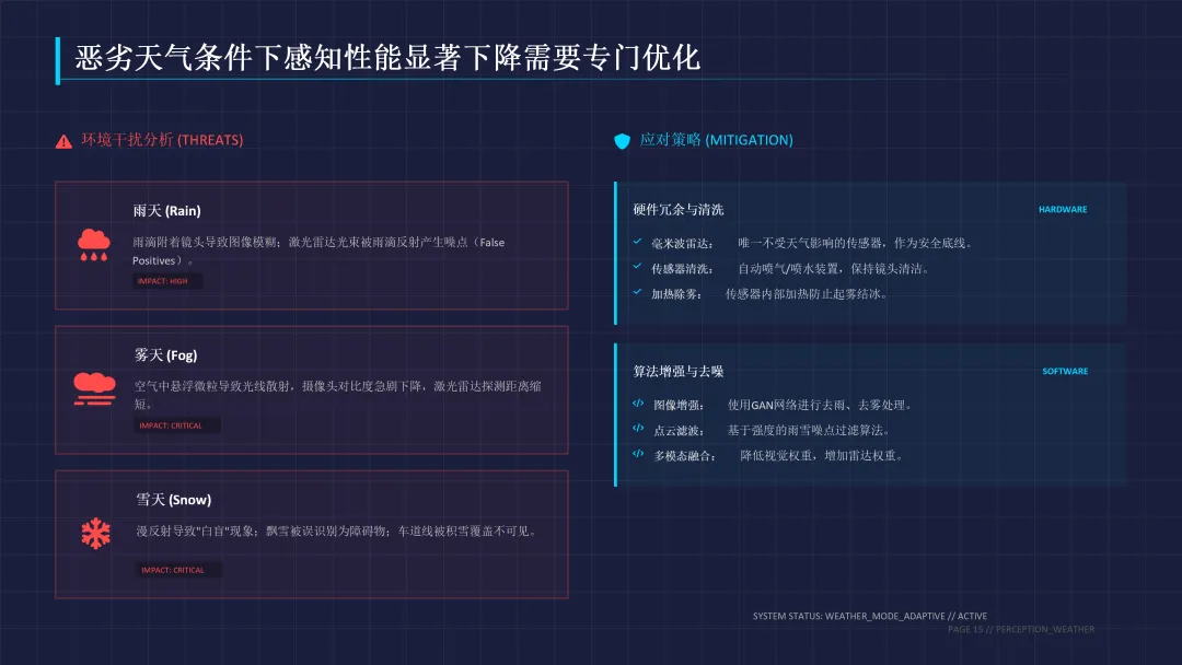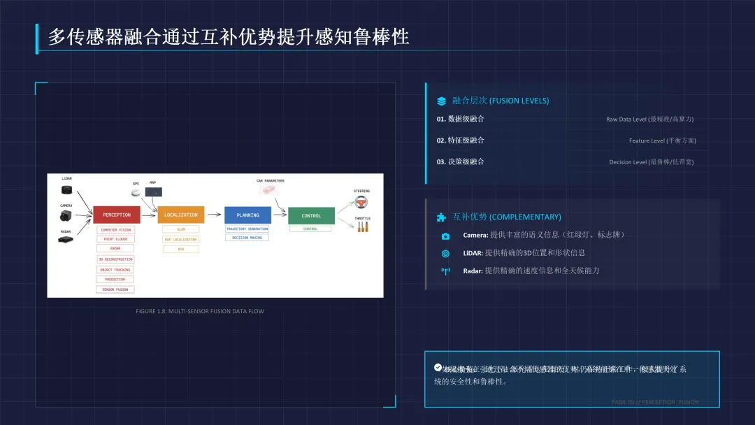 多传感器融合是感知算法的关键,通过卡尔曼滤波或深度学习网络将不同传感器的数据进行有效结合,以提供比任何单一传感器都更鲁棒和准确的环境模型[1]。
