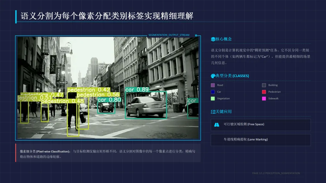 语义/实例分割 | 对图像或点云进行像素级或实例级的分类,以识别车道线、可行驶区域等。 | DeepLab系列, Mask R-CNN, U-Net |