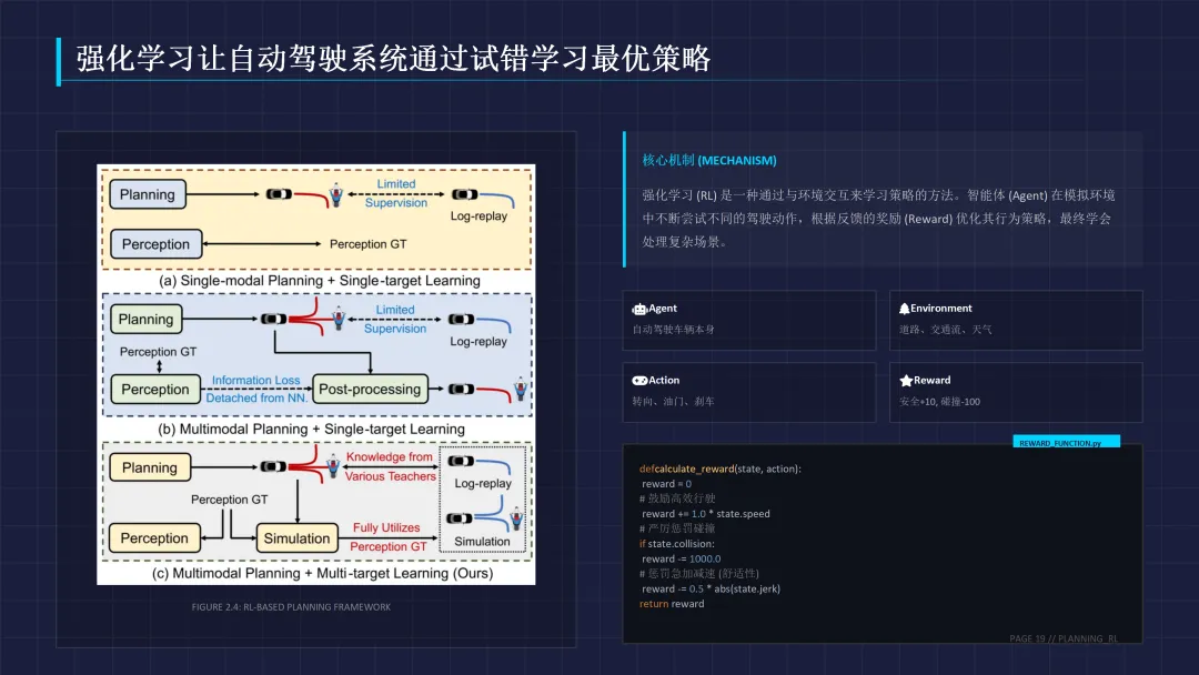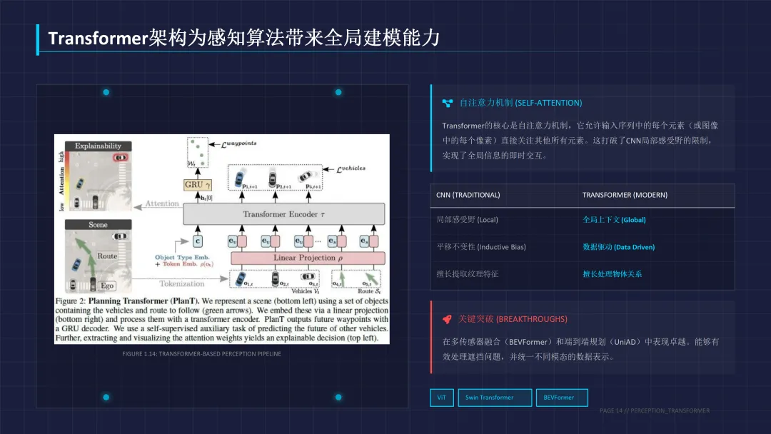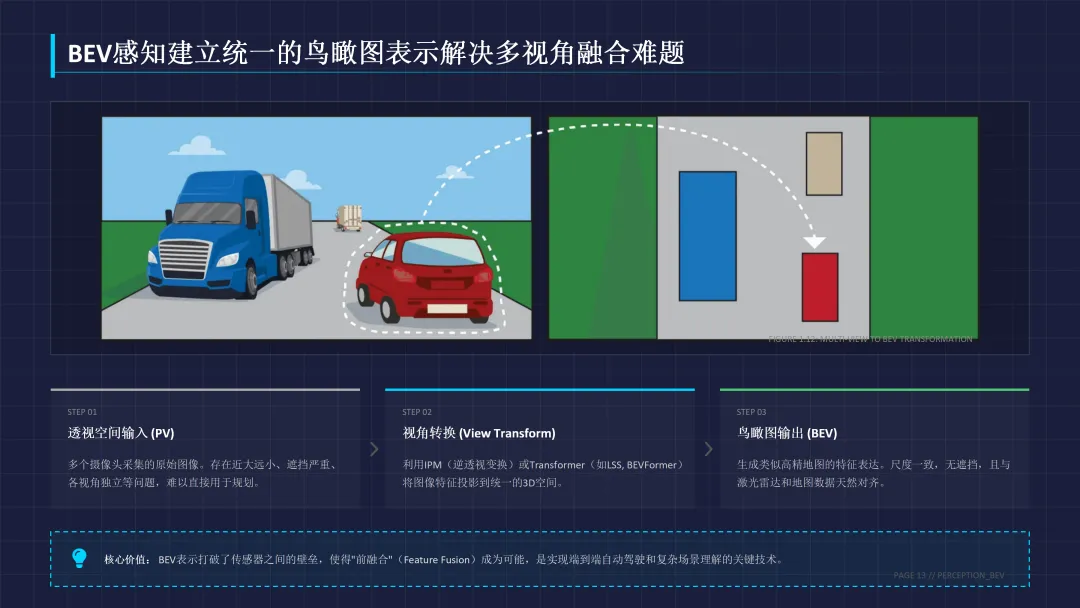 环境感知(Perception) | 识别和理解车辆周围的环境,包括静态和动态物体。 | 目标检测、语义分割、多传感器融合、BEV感知 |