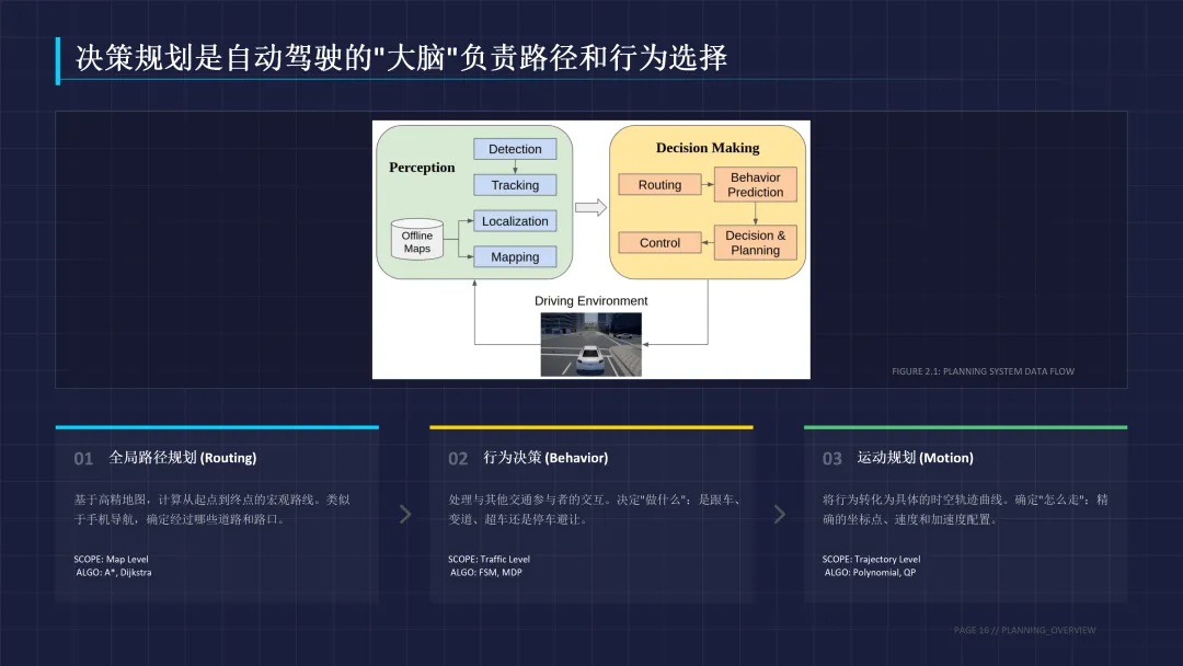 决策规划(Planning) | 基于感知结果,决定车辆的驾驶行为和行驶路径。 | 行为决策、全局路径规划、局部轨迹规划、轨迹预测 |