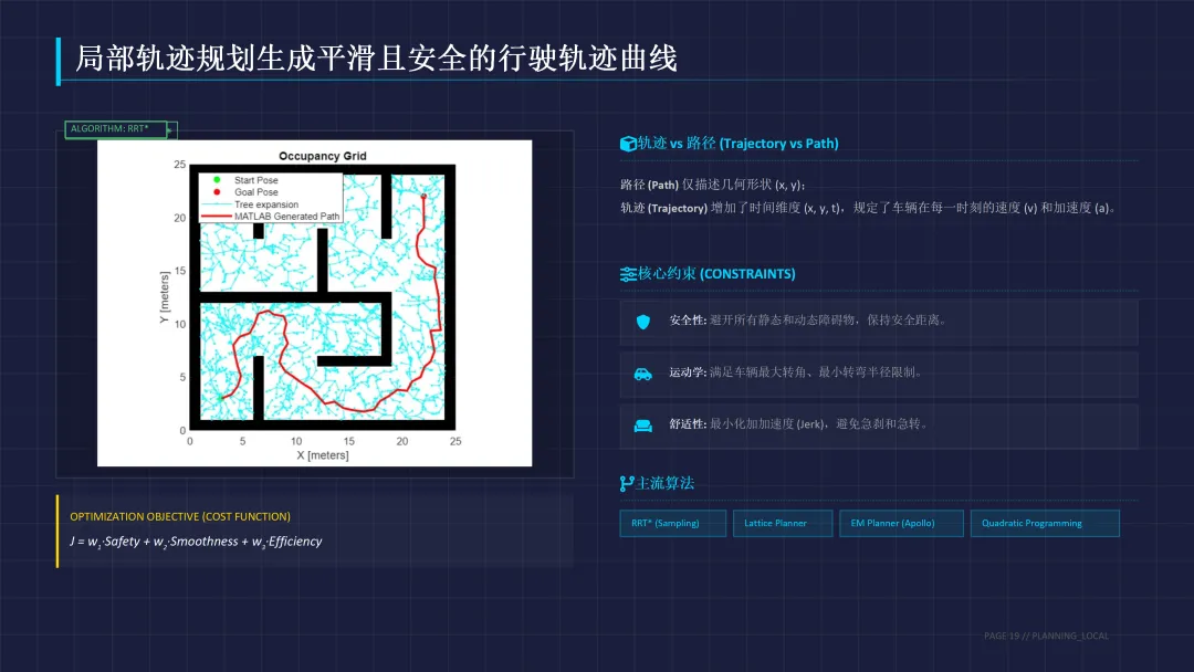 3局部轨迹规划(Local Motion Planning): 生成一条具体的、可执行的、无碰撞的行驶轨迹(包含位置、速度、加速度等信息)。常用算法包括采样法(RRT*)、优化法(QP)和曲线插值法。