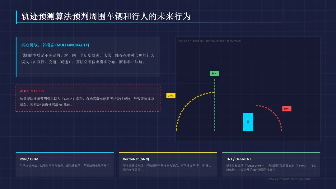 为了做出安全的决策,系统必须预测其他交通参与者(尤其是车辆和行人)的未来轨迹。基于学习的方法,特别是采用LSTM和Transformer网络的模型,已成为主流,它们能够更好地捕捉复杂的交互行为 [2]。