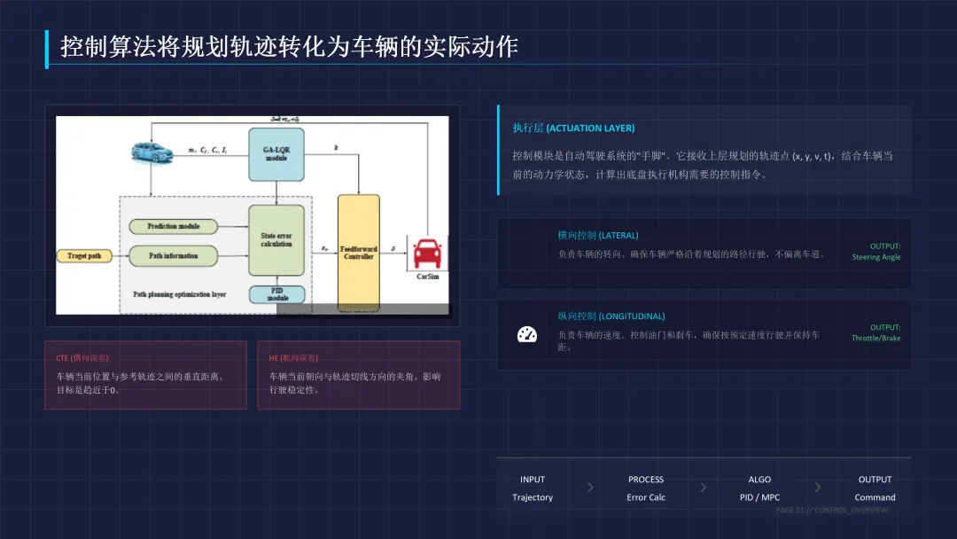 控制执行(Control) | 将规划好的路径和速度转化为具体的车辆控制指令。 | 横向控制(转向)、纵向控制(加减速)、轨迹跟踪 |