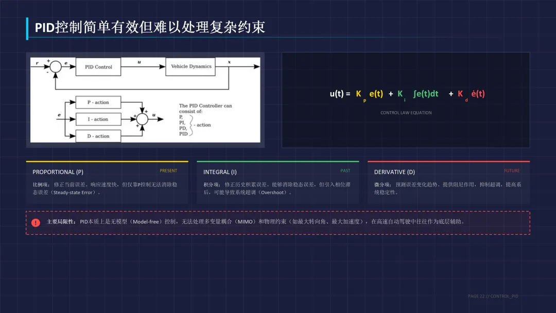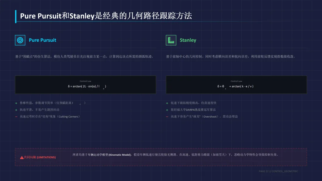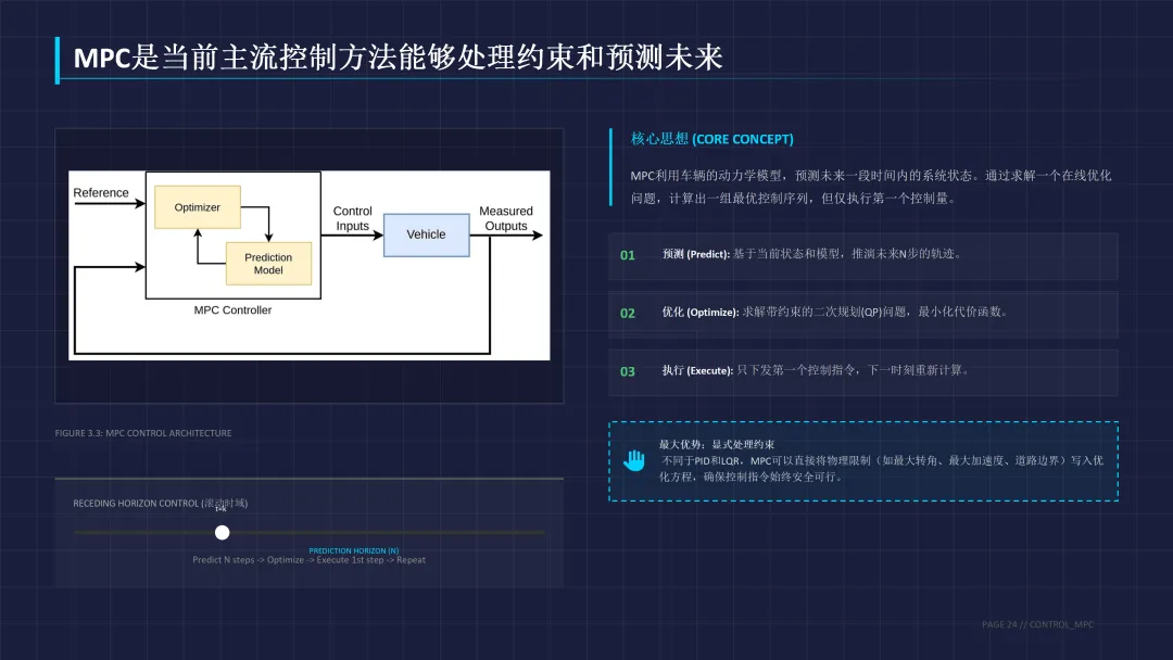 ◦MPC (模型预测控制): 当前最主流的方法,它通过车辆动力学模型预测未来状态,并在线优化控制输入,能够显式处理车辆的物理约束,如最大转向角和加速度 [3]。