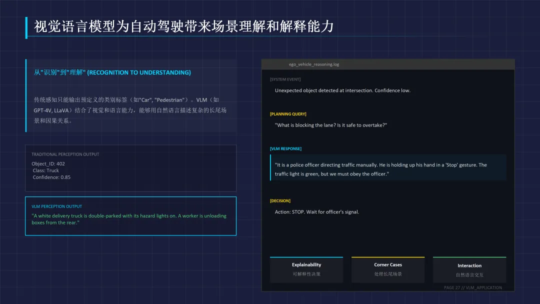 大模型(Foundation Models) | 利用视觉语言模型(VLM)等基础模型的常识推理能力,来理解复杂的交通场景和人类意图。 | GPT-4V, LLaVA for Driving |