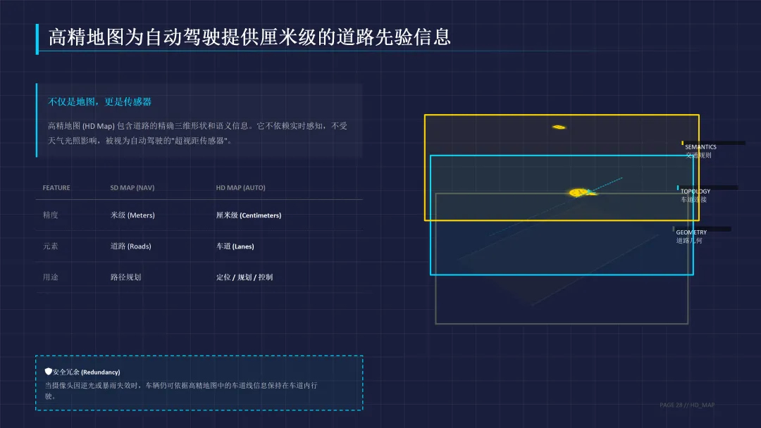 •高精地图(HD Map): 提供厘米级精度的先验道路信息,是实现高阶自动驾驶的重要保障。