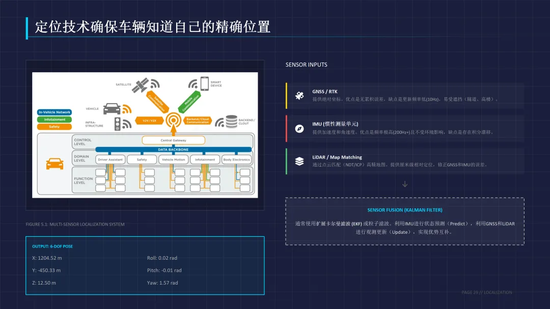 •定位(Localization): 结合GPS、IMU和传感器数据,实现车辆在地图上的精确位置和姿态估计。