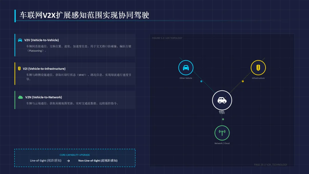 •车联网(V2X): 通过车与车、车与路侧设施的通信,扩展车辆的感知范围,实现协同驾驶。