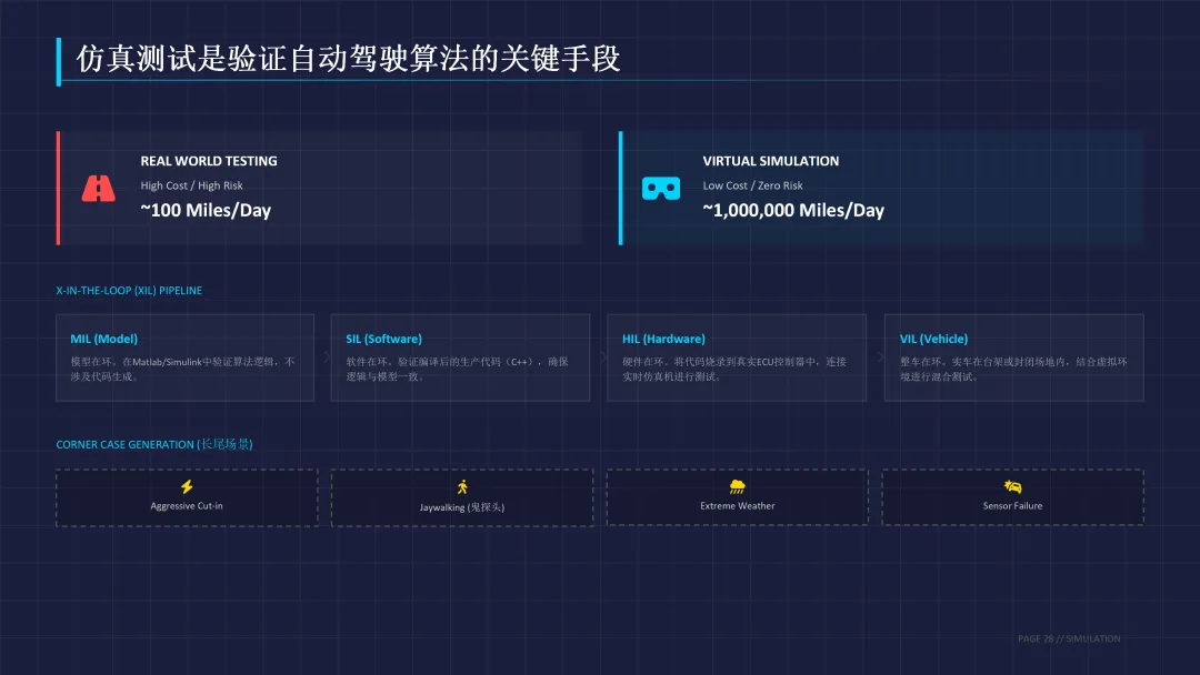 •安全验证: 如何在统计学上证明自动驾驶系统比人类驾驶员更安全,需要海量的测试里程和创新的验证方法。