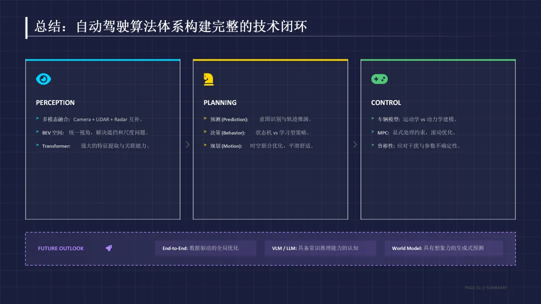 自动驾驶技术是人工智能、计算机视觉、传感器技术和车辆工程等多个领域交叉融合的产物,其核心在于一系列复杂的算法。本教材旨在系统性地梳理自动驾驶的关键算法体系,从环境感知、决策规划到控制执行,全面解析支撑车辆实现自主导航与驾驶的核心技术。本文档作为教材的总结部分,将对整个算法框架进行高度概括,并探讨其当前面临的挑战与未来发展趋势。