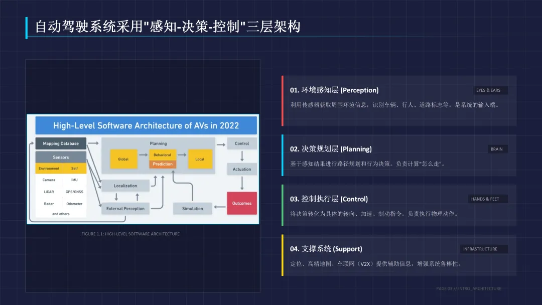 自动驾驶系统通常被设计为一个分层的架构,以实现从数据采集到车辆执行的完整闭环。这个架构主要包含三大核心模块,并由一系列关键技术提供支撑。
