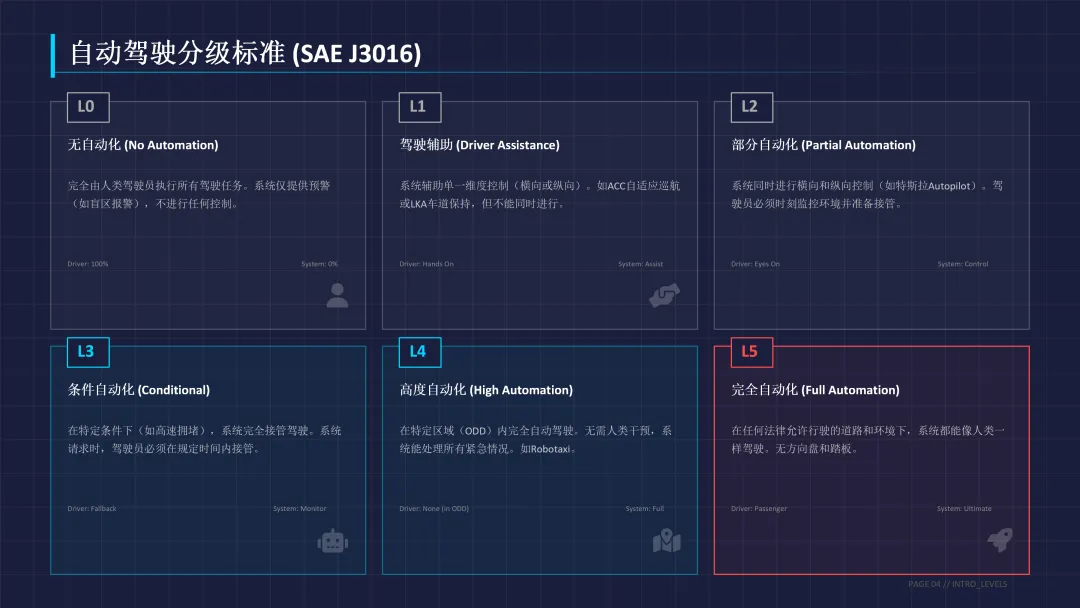 尽管自动驾驶技术已取得显著进展,但实现完全的无人驾驶(L5级别)仍面临巨大挑战: