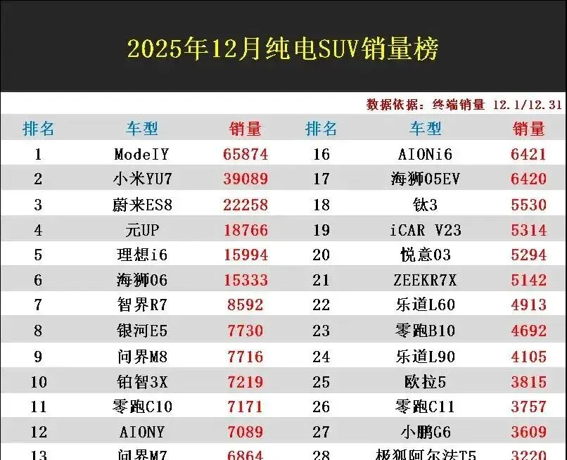 12月纯电SUV销量榜刚出炉,特斯拉Model Y一月狂卖6.5万辆!但更离谱的是,蔚来ES8居然杀进前三,销量2.2万辆——比上月翻倍!我当场笑出声:这波操作,谁顶得住?
