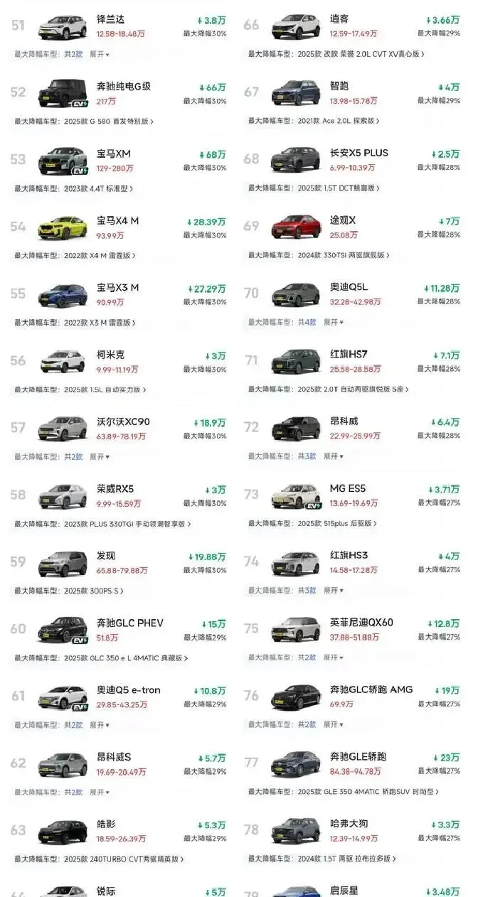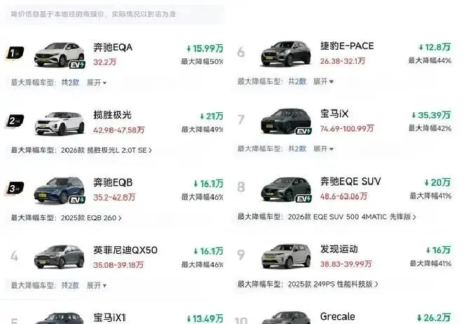说实话,看到这消息我手机都握出汗了。2026年1月这波SUV价格战,真不是小打小闹。奔驰GLB最大降幅50%,实际落地价比普通合资车还便宜;宝马X1、X4全线下探30%+,连揽胜星脉都敢送15万起步。大众途观L、丰田锋兰达?25%-35%的让利,哈弗H6、荣威RX5直接甩出3-5万。简单说,你掏20万买辆燃油SUV,去年可能要花25-28万。