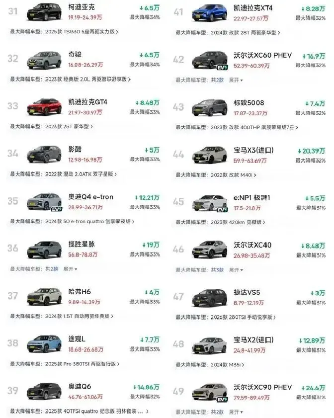 **第一,新能源车太能抢了**。去年新能源SUV政策加码,智能座舱、充电便宜,老司机们一窝蜂冲过去。传统车企急得直跳脚——再不降价,库存都得堆成山。就像我表弟,去年年底咬牙订了辆大众途观L,结果今年1月直接被砍了4万。他现在天天在群里骂:“早知道先蹲新能源,现在真成冤大头了。”
