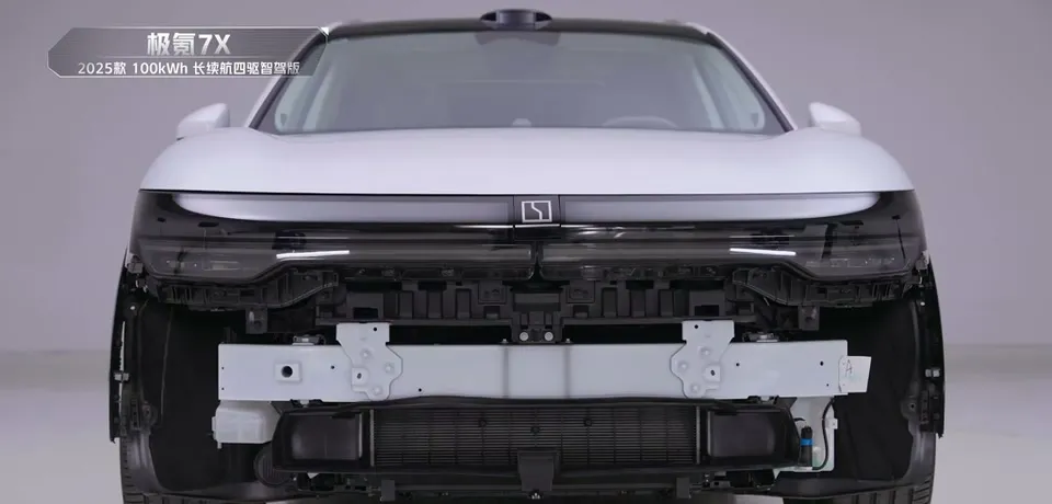 极氪7X拆除前保险杠,展示防撞梁及突出的大灯
