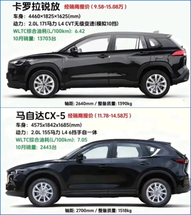 CX-5和卡罗拉锐放这组对比其实挺有意思,一个降价后突显性价比,另一个是销量王者。