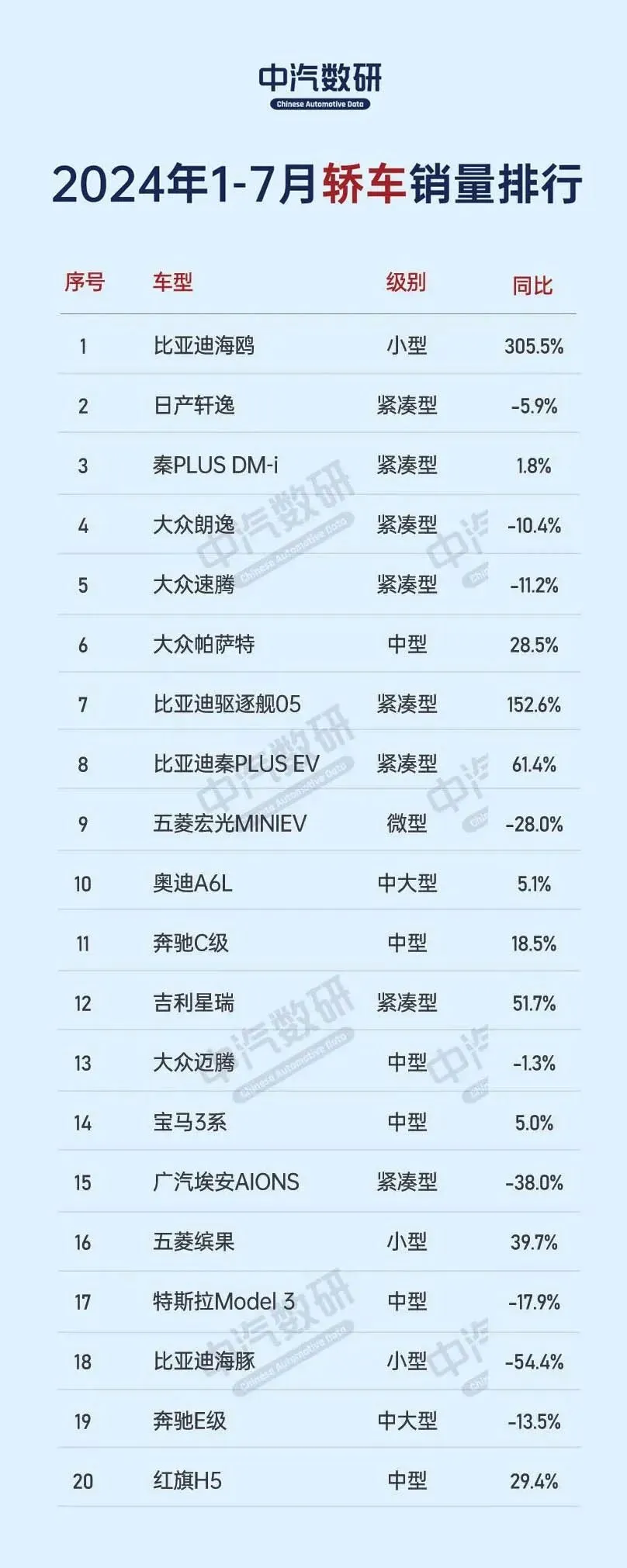 尽管1-7月国内乘用车整体市场持续展现增长活力,轿车领域的传统格局却悄然生变,销量遭遇寒流。2024年1-7月,国内轿车零售总量滑落至533.2万辆,较SUV市场表现逊色,且同比缩减了1.8%。在销量过万车型的激烈竞争中,比亚迪海鸥异军突起,以20.2万辆的佳绩问鼎轿车销量榜首,将昔日的冠军日产轩逸(18.3万辆)挤至亚军。比亚迪秦PLUS DM-i紧随其后,以17.4万辆的销量稳居第三。值得一提的是,比亚迪家族的驱逐舰05与秦PLUS EV通过价格调整策略,销量显著攀升,分别位列第七与第八。大众品牌旗下的朗逸、速腾、帕萨特依旧保持强劲,排名分列4~6位,但销量数据透露出市场竞争的激烈。国产燃油轿车领域,吉利星瑞以9万辆的累计销量摘得桂冠,超越了长安逸动与吉利帝豪,后者则分别滑落至第22与第24位。另一方面,比亚迪海豚的销量遭遇重创,同比暴跌54.4%,仅售出8万辆,在7月的轿车领域排名滑落至第18。而红旗H5则成为国产中型车的亮点,以7.8万辆的销量超越本田雅阁与丰田凯美瑞,后两者销量分别减少24.4%与38.7%。丰田卡罗拉作为全球轿车销量曾经的霸主,今年表现黯淡,1-7月销量仅6.5万辆,同比大跌42.0%。其姊妹车型雷凌同样遭遇滑铁卢,销量锐减42.8%。比亚迪秦L DM-i作为新晋热门车型,虽表现不俗,但累计销量5.1万辆,仅列第36位。大众ID.3在新能源轿车领域表现稳健,仅次于特斯拉Model 3,累计销量4.6万辆。别克威朗销量同样大幅缩水,同比下跌48.4%,排名下滑至第48位。奥迪A3在豪华紧凑型车市场保持领先,而奔驰A级则销量平平。比亚迪新推出的海豹06,作为宋L DM-i的姊妹车型,上市即受热捧,7月销量突破2万辆,累计销量已达2.9万辆,排名第61位。雪佛兰科鲁泽与风神奕炫、蔚来ET5等车型则面临销量腰斩的困境,市场地位受到挑战。
