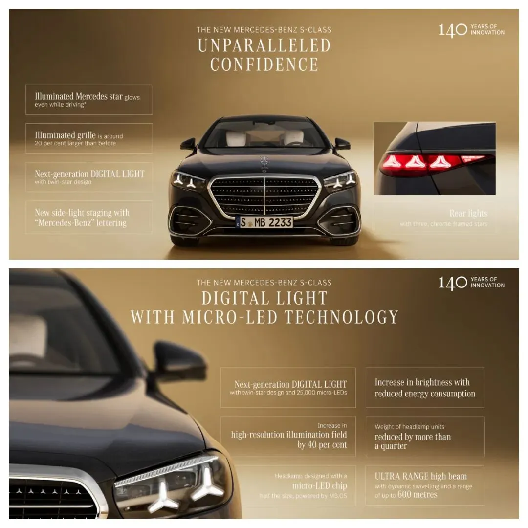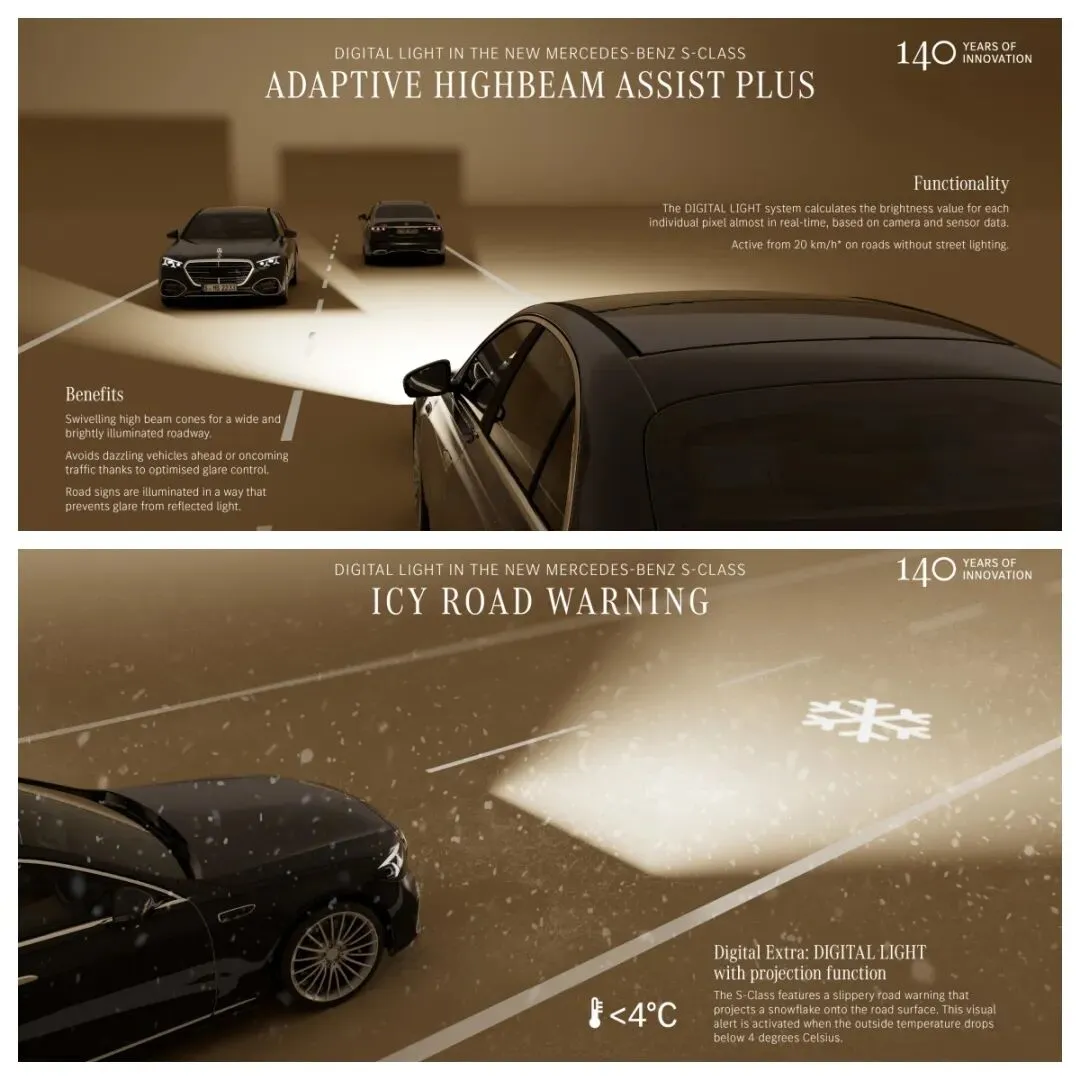 从1886年戈特利布·戴姆勒汽车上的烛光灯,到如今具备投影功能的数字大灯,梅赛德斯-奔驰始终照亮汽车历史的每个时代——而在全新S级轿车中,这项科技正将夜幕转化为智能化的安全与舒适屏障。