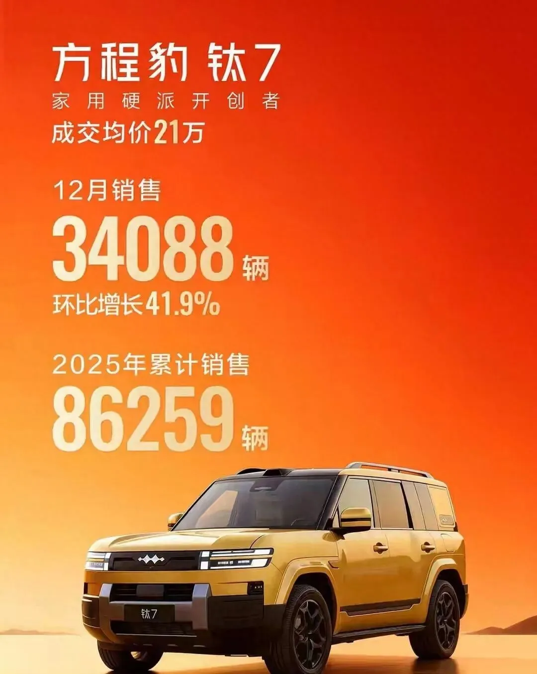 2026年方盒子SUV市场火药味正浓!方程豹钛7去年12月单月狂销34088辆,上市4个月累计卖了8.6万辆,相当于每天有900多台开回家,直接拿下混动SUV和方盒子市场双冠军。眼看对手势头这么猛,长城终于亮出底牌——基于全新归元平台打造的首款方盒子SUV,谍照最近在网上刷了屏。这台车定位很明确,就是要在18-22万元价格带和钛7正面硬刚,未来还会提供插电混动、混动、纯电等多种动力版本,不管你是家用还是追求个性,都能找到适配的选择。