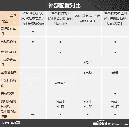 外部配置方面,四款车型各有侧重。沃尔沃XC70独享无框设计车门,视觉效果更具时尚感。领克09 EM-P独享矩阵式灯光特色功能,魏牌 蓝山独享辅助驾驶灯,两款车型的科技感更突出。坦克500新能源则独享电动吸合尾门,进一步提升了使用便利性。不过,沃尔沃XC70也是唯一一款未配备前排和后排侧窗多层隔音玻璃和后排侧隐私玻璃的车型,实用性表现稍逊一筹。
