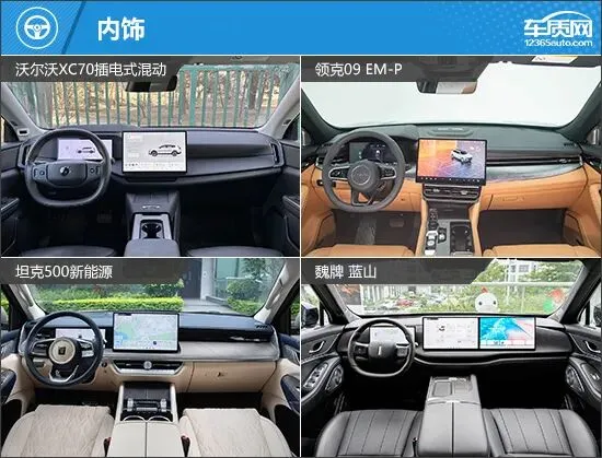 车身尺寸方面,魏牌 蓝山在车长、车宽和轴距三个维度占据优势,坦克500新能源则在车高方面领先。轮毂方面,魏牌 蓝山标配21英寸轮毂,气场十足;领克09 EM-P标配20英寸轮毂;沃尔沃XC70和坦克500新能源均标配19英寸轮毂,并提供额外尺寸轮毂选装,可满足不同用户的个性化需求。