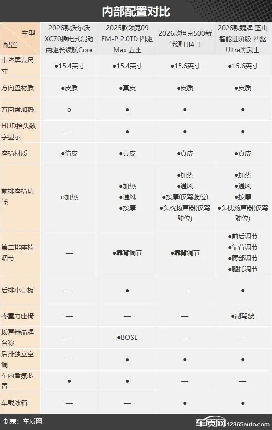 内部配置方面,除沃尔沃XC70外,其余三款车型的表现都令人满意,均标配方向盘加热、HUD抬头数字显示、真皮材质座椅、第二排座椅靠背调节以及后排独立空调。其中,领克09 EM-P独享BOSE品牌扬声器,魏牌 蓝山则独享第二排座椅前后/腰部/腿托调节以及副驾驶零重力座椅,进一步强化了座舱的豪华舒适属性。相比之下,沃尔沃XC70在配置层面缺失较多,与其他三款车型存在一定差距。