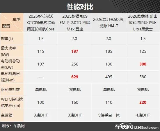 从参数来看,领克09 EM-P的发动机最大功率与电动机总扭矩最为突出,魏牌 蓝山则在电动机总功率与WLTC纯电续航里程方面优势明显。