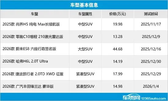 本期选取的6款车型包括3款中型SUV、2款紧凑型SUV和1款大型SUV,涵盖自主和合资品牌,包含燃油车和新能源车。