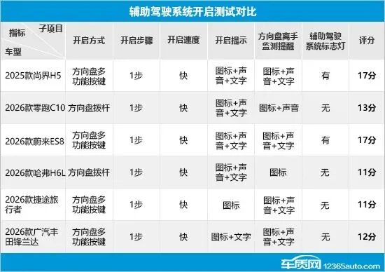 在辅助驾驶系统开启测试对比中,2026款零跑C10(以下简称:零跑C10)和2026款哈弗H6L(以下简称:哈弗H6L)采用方向盘拨杆开启,其余车型均为方向盘多功能按键开启。开启步骤方面,6款车型均只需1步,并且开启速度快,日常使用便捷。开启提示方面,除了2026款捷途旅行者(以下简称:捷途旅行者)和2026款广汽丰田锋兰达(以下简称:丰田锋兰达)之外,其余车型均为三种提示方式。此外,6款车型均配备方向盘离手监测提醒功能,2025款尚界H5(以下简称:尚界H5)、2026款蔚来ES8(以下简称:蔚来ES8)、捷途旅行者和丰田锋兰达均提供图标、声音和文字提示,表现出色。值得一提的是,尚界H5和蔚来ES8还配备了辅助驾驶系统标志灯,能够为其他道路参与者提供明显提示。