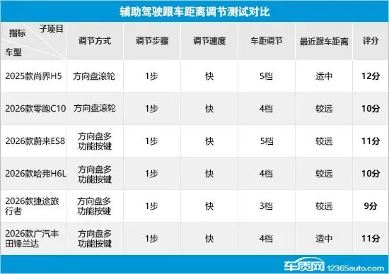 在辅助驾驶跟车距离调节测试对比中,6款车型的调节步骤均为1步,且调节速度表现出色。不过在车距调节方面,尚界H5和蔚来ES8支持5档车距调节,档位较多,而捷途旅行者则表现一般,仅支持3档车距调节。此外,在最近跟车距离方面,零跑C10、蔚来ES8、哈弗H6L和捷途旅行者的测试成绩均不太理想。