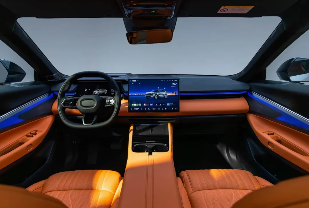 车辆的内饰配备多规格显示硬件,包括 12.3 英寸液晶仪表盘与 15.4 英寸中控屏,不同尺寸的显示硬件分别承担行车信息展示与车机操作交互的功能,车机系统为 LYNK Flyme Auto 系统,该系统搭载骁龙 8295 芯片,芯片为车机系统的运行提供算力支撑,保障系统的操作响应与功能实现,显示硬件与车机系统形成内饰的智能硬件核心。