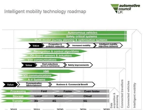 这张技术路线图展示了自动驾驶从2010到2030年的发展路径。从通信娱乐到商业效益,从成本降低到安全改进,从拥堵减少到流动性提升——每一步都是渐进式的演进。