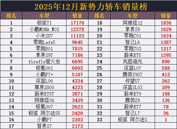 大家都知道近两年新势力品牌销量扩张非常迅速,在SUV领域已经有多款车型月均销量轻松破万,发展不错,而在另一重要的轿车市场表现则是另一番景象。不仅活跃在市场上的新势力车型比SUV少的多,而且热销车型占比也更低,但是市场竞争却也异常激烈,榜单格局正在加速洗牌。据2025年12月新势力轿车销量榜显示,上榜车型仅有33款,而销量破万的更是只有3款车型。长期霸榜的小米SU7意外降至第3,零跑Lafa5,零跑B01等备受关注的新车型月销均不足万辆,而登顶榜首的居然是后来居上的极狐T1,小鹏MONA M03紧随其后,表现稳定,享界S9T成功突围,强势反超极氪001、小鹏P7+等热门车型,尊界S800也高居第11,成功拿下超豪华轿车的销冠,而低调的仰望U7则表现不佳,月销还不到500辆,排名低至第27名。从榜单数据来看,极狐T1以17170辆的销量成功登顶,小鹏MONA M03销量超1.2万辆表现稳定,小米SU7持续下滑,月销仅剩万辆出头,已不到巅峰期的一半,零跑B01、享界S9T都7000多辆,销量出色,firefly萤火虫成功跻身前10,月销突破6000辆,深蓝L06不足5000辆,尊界S800月销高达4223辆,占据了本就小众的超豪华轿车市场的大部分销量,蔚来ET5T、阿维塔06都超3000辆,极氪007、极狐 阿尔法S5均入榜前15名。阿维塔12销量不足2000辆,表现一般,智己L6、蔚来ET5都千辆出头,表现中规中矩,深蓝L07月销588辆,仰望U7市场表现不及预期,单月售出362辆,深蓝SL03销量暴跌,蔚来ET9、腾势Z9仅百辆出头,销量低迷,最后,蔚来ET7、智己L7排名垫底,月均销量都在百辆以下,销量非常惨淡。