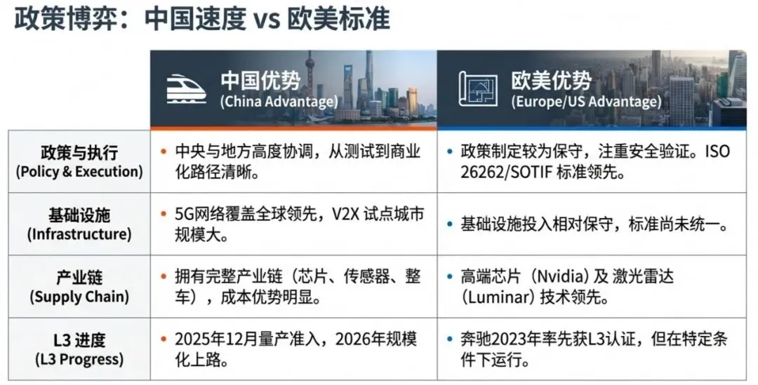 中国的政策优势在于协调性和执行速度。从测试到商业化的路径清晰,多地地方政府同步推进,V2X(车联网技术)和5G基础设施覆盖率高,产业链从芯片到传感器到整车厂配套完整。这让中国有可能在L3量产和Robotaxi规模化上实现弯道超车。
